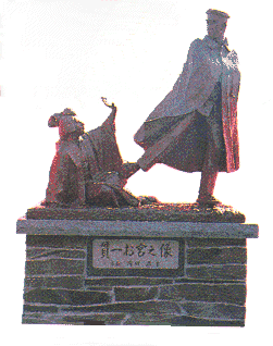 ↑貫一お宮↑ 尾崎紅葉の『金色夜叉』より貫一お宮 現代ではかなりタブーとされている女性への暴力 女をあしげにしてるこんな像を これ見よがしに建てておいてもいいのかなぁ 田嶋先生が壊しにこないか 非常に心配です